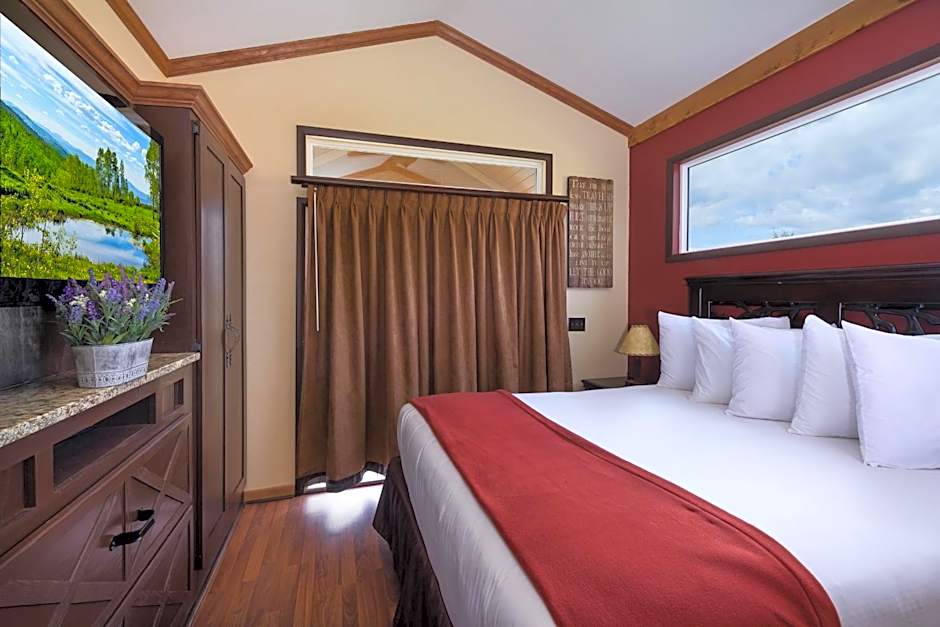 The Lodge Suite features a sofa, 51-inch flat-screen television, and kitchen with a mini refrigerator, microwave, and stovetop and oven. The private bath has a shower and tub combination. Extras include a screened-in patio.