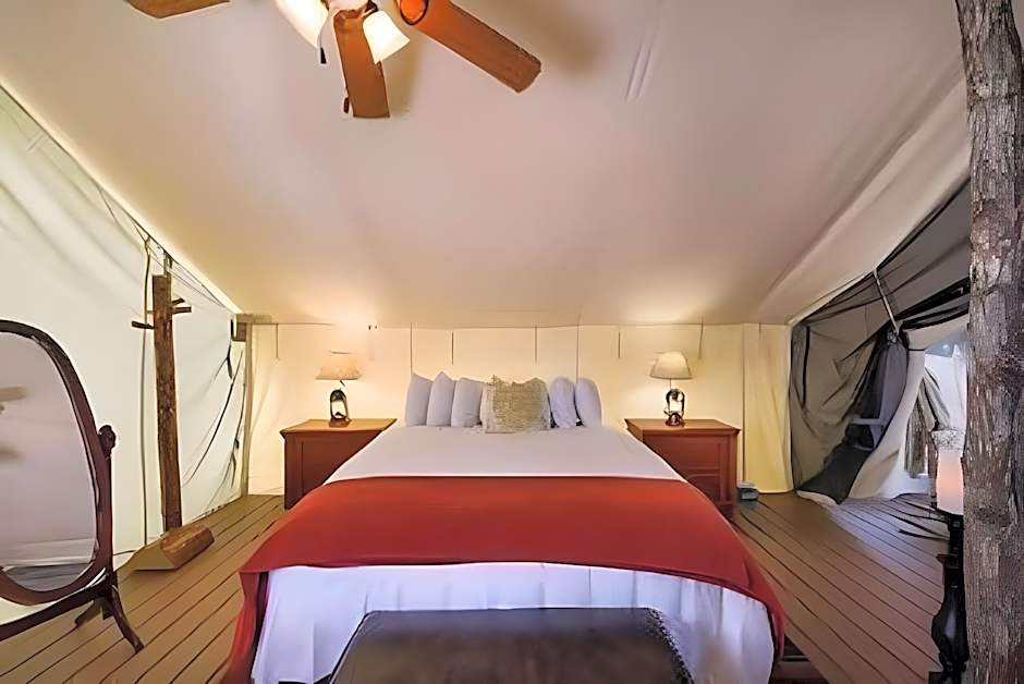 住宿選擇多樣,從 Lodge Cottage(King 大床、1 房,705 平方英尺,可容納 10 位成人與 6 位兒童,配有一張特大床和一張沙發床)到帶小廚房的 Lodge(Kitchenette 選項,可容納 10 位成人與 6 位兒童)。其他選擇包括標準帳篷(Tent Standard,2 位成人、0 位兒童)、豪華帳篷(Tent Luxury,7 位成人、6 位兒童)以及提供水電接駁的房車位(RV Site Water And Electric,2 位成人、1 位兒童)。Luxe Conestoga Wagon 則提供一個適合兩位成人及一位兒童的緊湊選項,進一步擴展了可選的住宿類型。